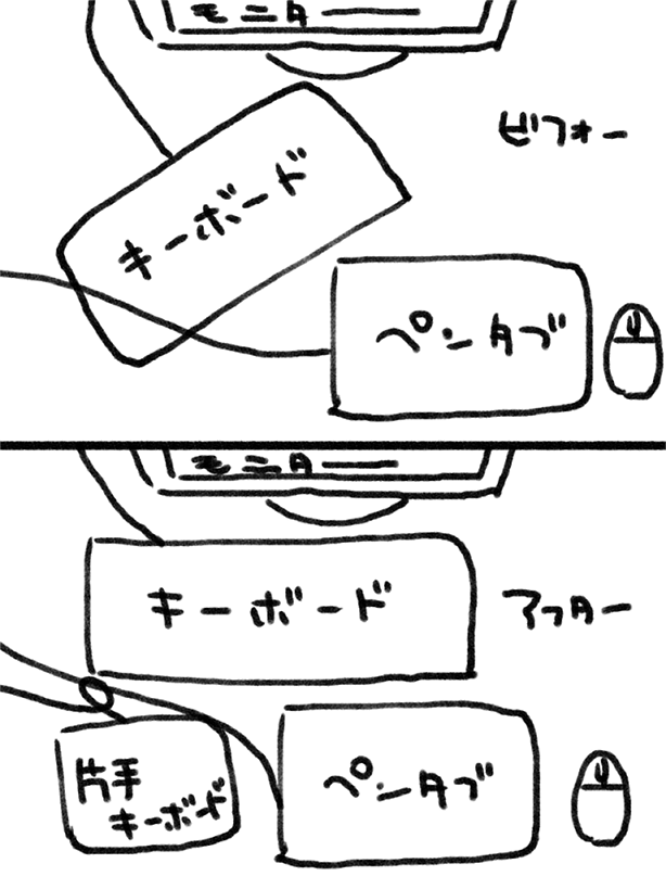 PCデスク上で一番奥にモニター、モニター手前にキーボード、キーボードの手前にペンタブを配置してて、ショートカットキー使いたい時左手をキーボードまで伸ばさなきゃならなくて、そうなると左手の肩が死ぬから結果的に絵を描く時だけキーボードが斜めになる…それでもペンタブがちょっと邪魔でキーボードを手前に寄せれず、やっぱり左腕と肩の負担が大きかったので、左手デバイスが欲しかったってワケ。